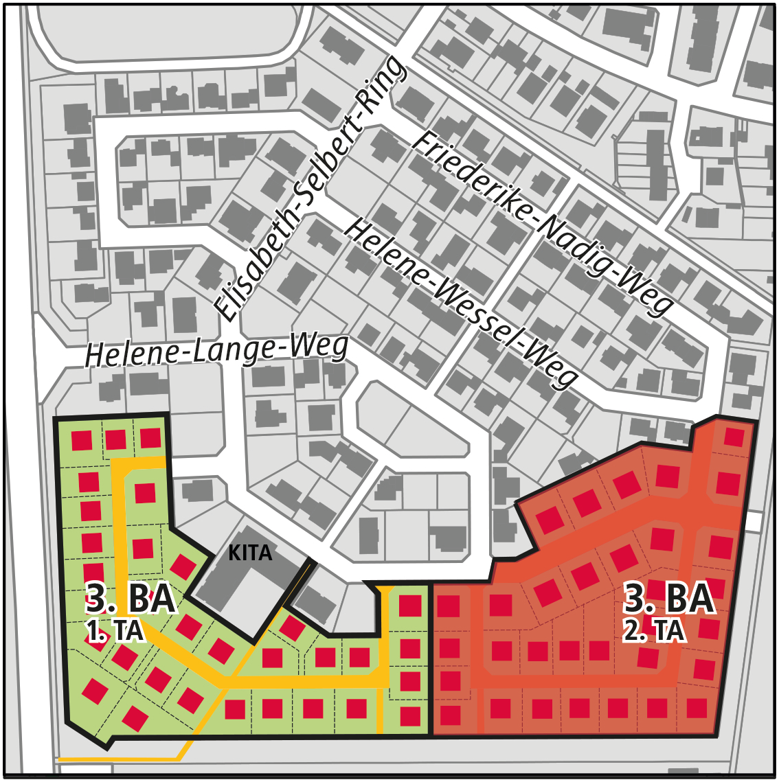 Die Vermarktung des 1. Teilabschnitts im 3. Bauabschnitts hat begonnen. Vorerst werden im 1. Teilabschnitt 32 Baugrundstücken vermarktet.