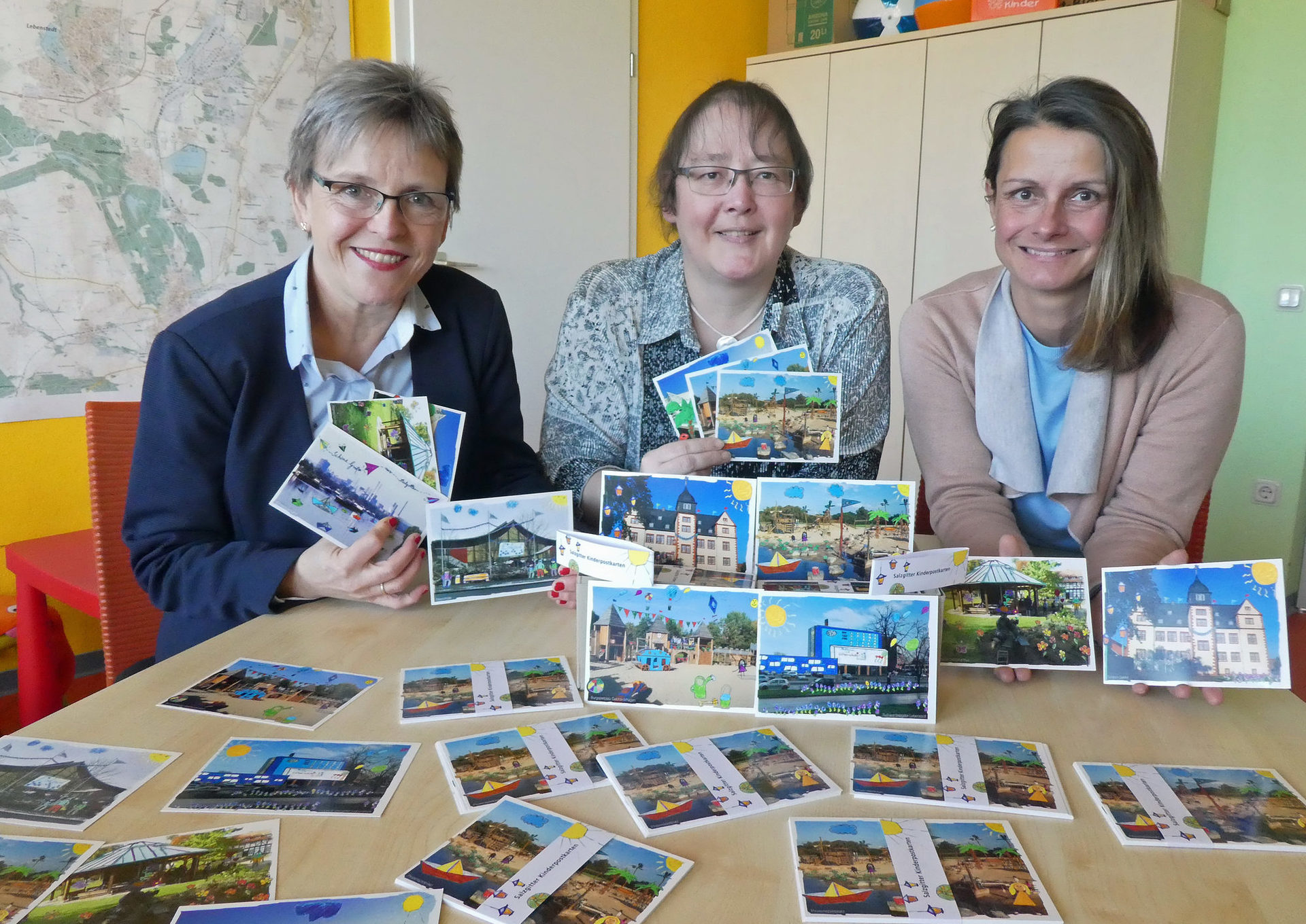 Die Entwürfe für diese Postkarten entstanden während eines talentCampus der Volkshochschule, bei dem Sylvia Fiedler, die Kinder- und Familienbeauftragte der Stadt Salzgitter, mit der Sozialarbeiterin bei der Wohnbau Salzgitter, Petra Stürmer, eine lang gehegte Idee verwirklichte. Kinder zwischen 9 und 13 Jahren waren zu Fuß und mit dem Bus in Salzgitter unterwegs und entdeckten ihre Stadt. Sie verschönerten dann die realen Fotos ihrer Lieblingsplätze kreativ mit vielen bunten Stiften. Die Sonne über dem Ritterburgspielplatz lächelt nun beispielweise auf die Kinder und vor dem Rathaus wehen viele Luftballons in den kahlen Bäumen. Ein Grafiker setzte diesen malerischen Ideenreichtum der Mädchen und Jungen anschließend professionell als Postkartenmotiv um. Der Kooperation zwischen der Stadt Salzgitter und der Wohnbau schloss sich für den Druck der Postkarten die Tourismusförderung der WIS an.