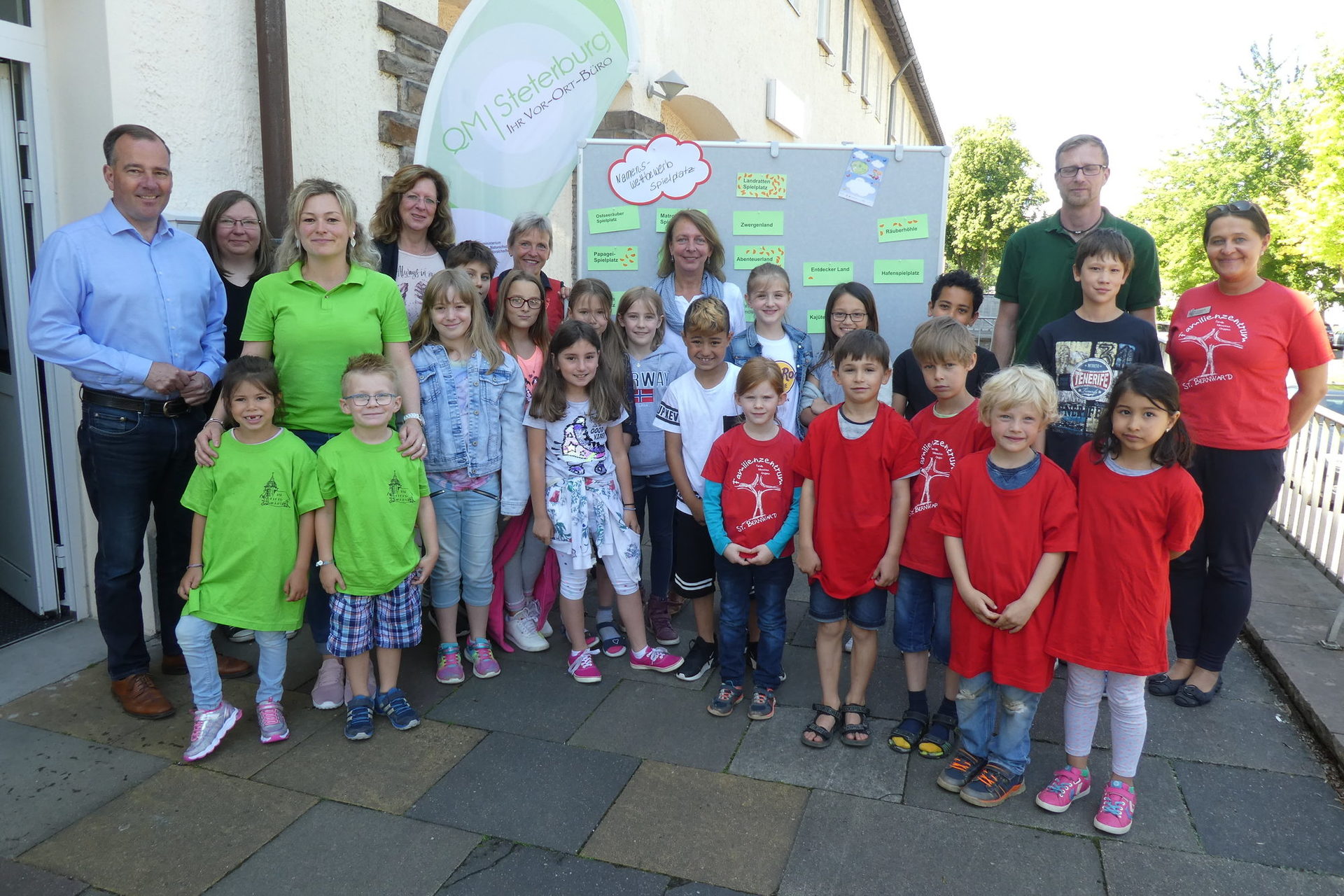 Die Mehrheit der Jury entschied sich für den Namen „Landratten-Spielplatz“. Das Foto zeigt Kinder aus dem Kindergarten Stiftsmäuse, dem Familienzentrum St. Bernward, die Klassensprecher der dritten und vierten Klasse der Grundschule sowie Sylvia Fiedler, Kinder- und Familienbeauftragte der Stadt Salzgitter, Diana Graf und Sabine Naats aus dem Quartiersmanagement, Ortsbürgermeister Christian Striese und die Betreuerinnen und Betreuer der Kitas und Grundschule.