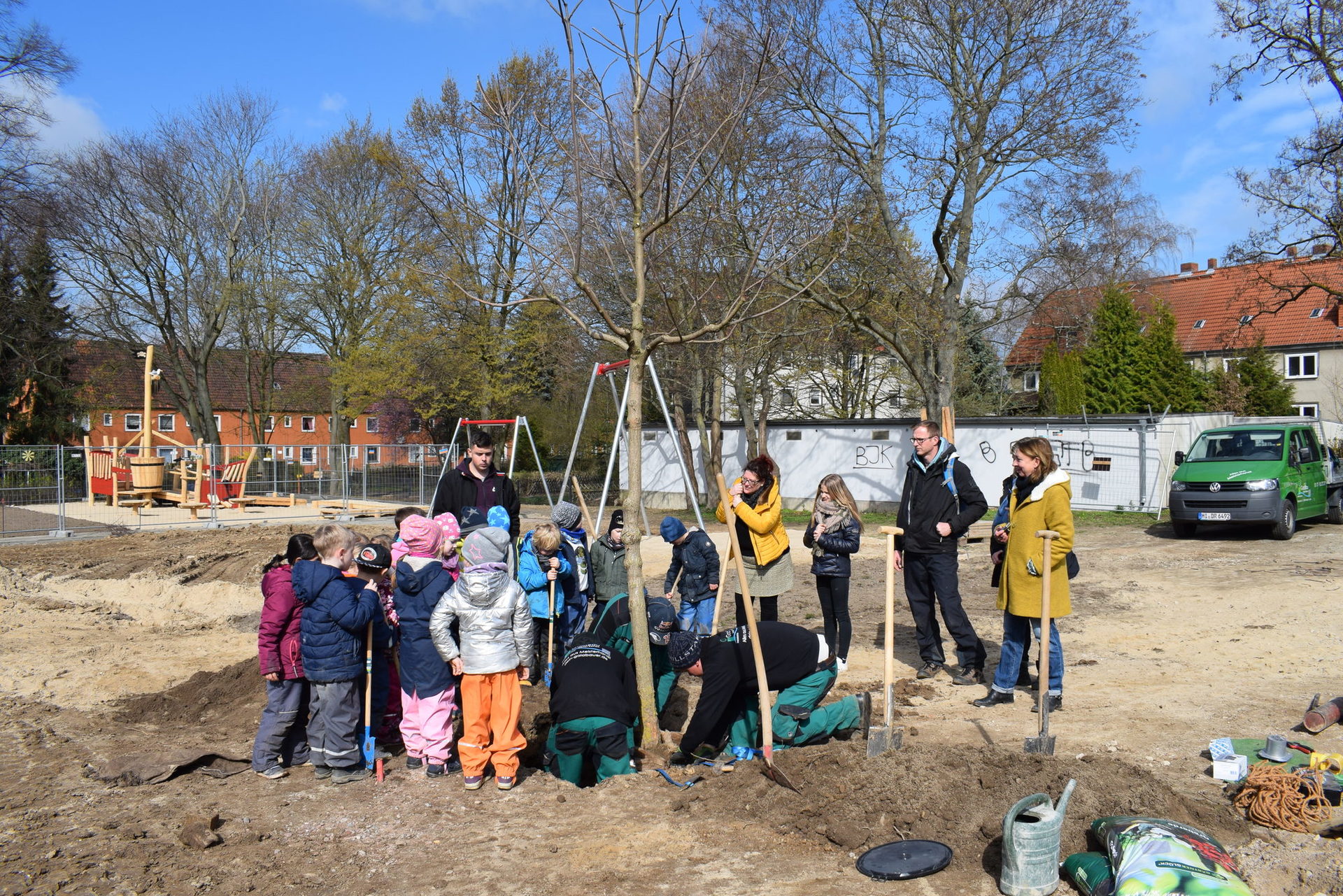 Am Donnerstag, 28. März war die Hilfe der Kinder aus dem Kindergarten St. Bernward gefragt, denn der erste neue Baum musste gepflanzt werden.