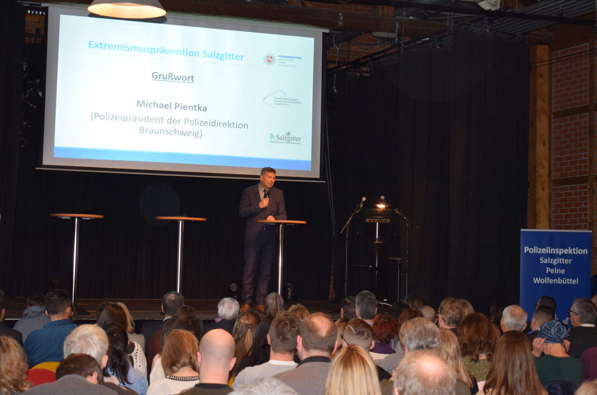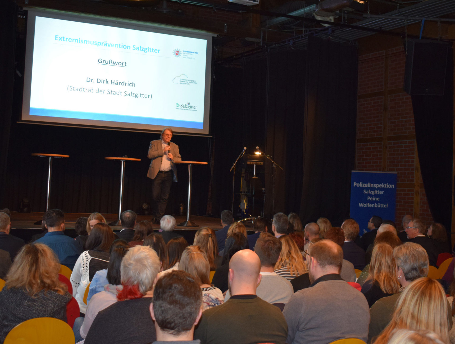 Etwa 120 Gäste waren der gemeinsamen Einladung der Polizeiinspektion Salzgitter / Peine / Wolfenbüttel, der Stadt Salzgitter und des Präventionsrates gegen Gewalt und Kriminalität in die Kulturscheune gefolgt. „Das zeigt, wie wichtig das Thema Prävention ist.“, betonte Stadtrat Dr. Dirk Härdrich in seiner Begrüßung. Michael Pientka, der Polizeipräsident der Polizeidirektion Braunschweig zeigte sich erfreut über das Salzgitteraner Netzwerk und lobte: „Extremismusbereiche sind in Bewegung, egal ob Links- und Rechtsextremismus, Islamismus oder Salafismus. Es ist gut, dass Sie sich in Salzgitter auf den Weg gemacht haben, um gemeinsam als Expertinnen und Experten das Thema Extremismus anzugehen.“