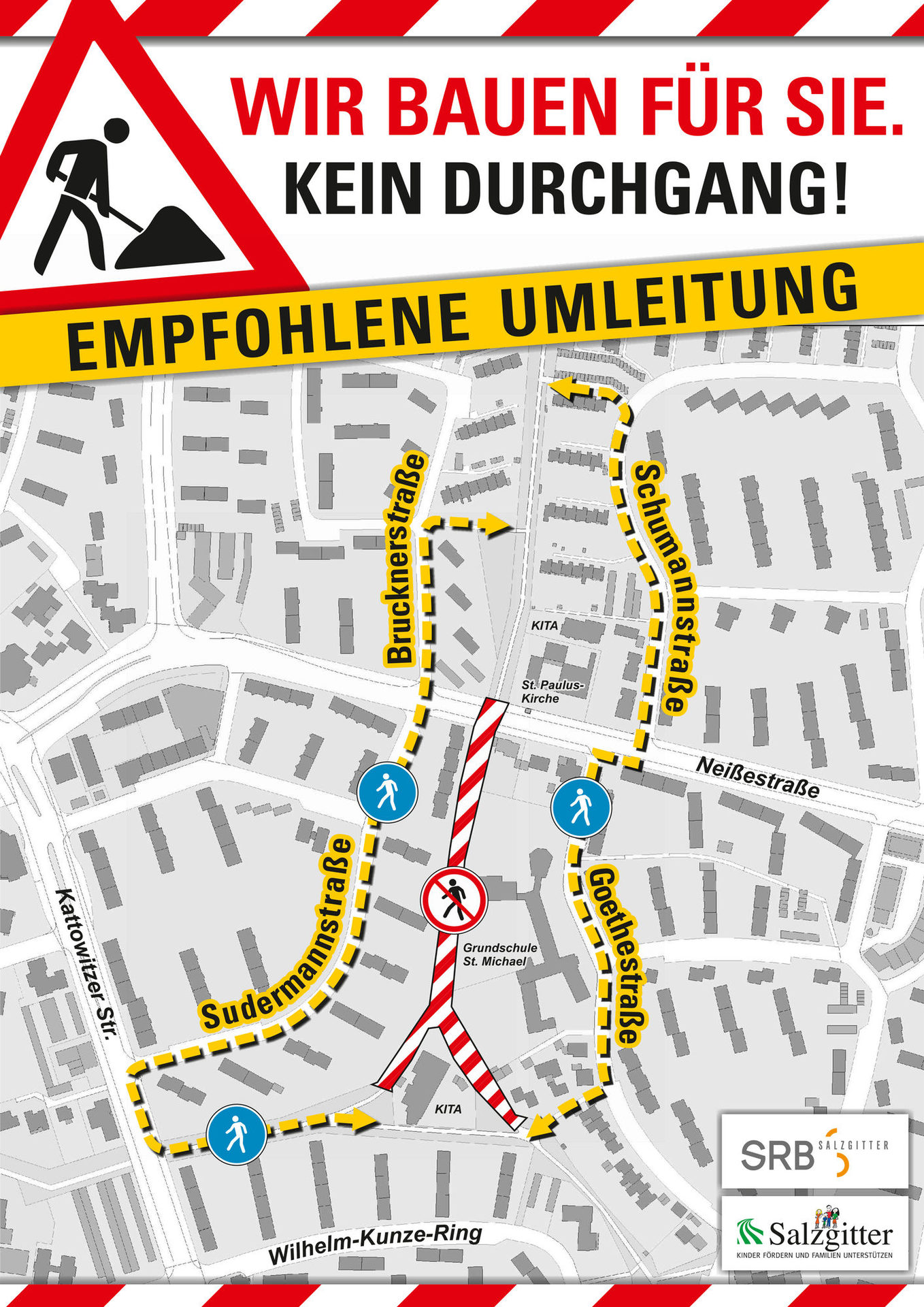 Die Fußgängerinnen und Fußgänger sowie die Radfahrerinnen und Radfahrer dürfen während dieser Arbeiten den Baustellenbereich der Seewegachse von der Neißestraße bis zur Kita Wilhelm-Kunze-Ring aus Sicherheitsgründen nicht betreten. Die ausgeschilderte Umleitung ist zu nutzen.