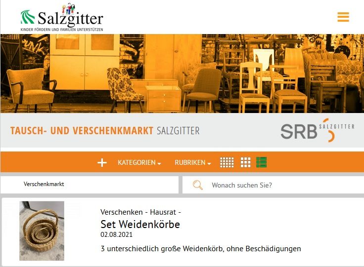 Unter www.verschenkmarkt-salzgitter.de (Öffnet in einem neuen Tab) können alle Angebote für Dinge, die getauscht oder verschenkt werden sollen, 24 Stunden am Tag, 365 Tage im Jahr unkompliziert und ohne Angabe von persönlichen Daten inseriert werden. Von Möbeln über Haushaltsgegenstände bis hin zu Elektronikartikeln findet sich hier vieles, was der eine nicht mehr braucht, bei anderen aber heiß begehrt ist.