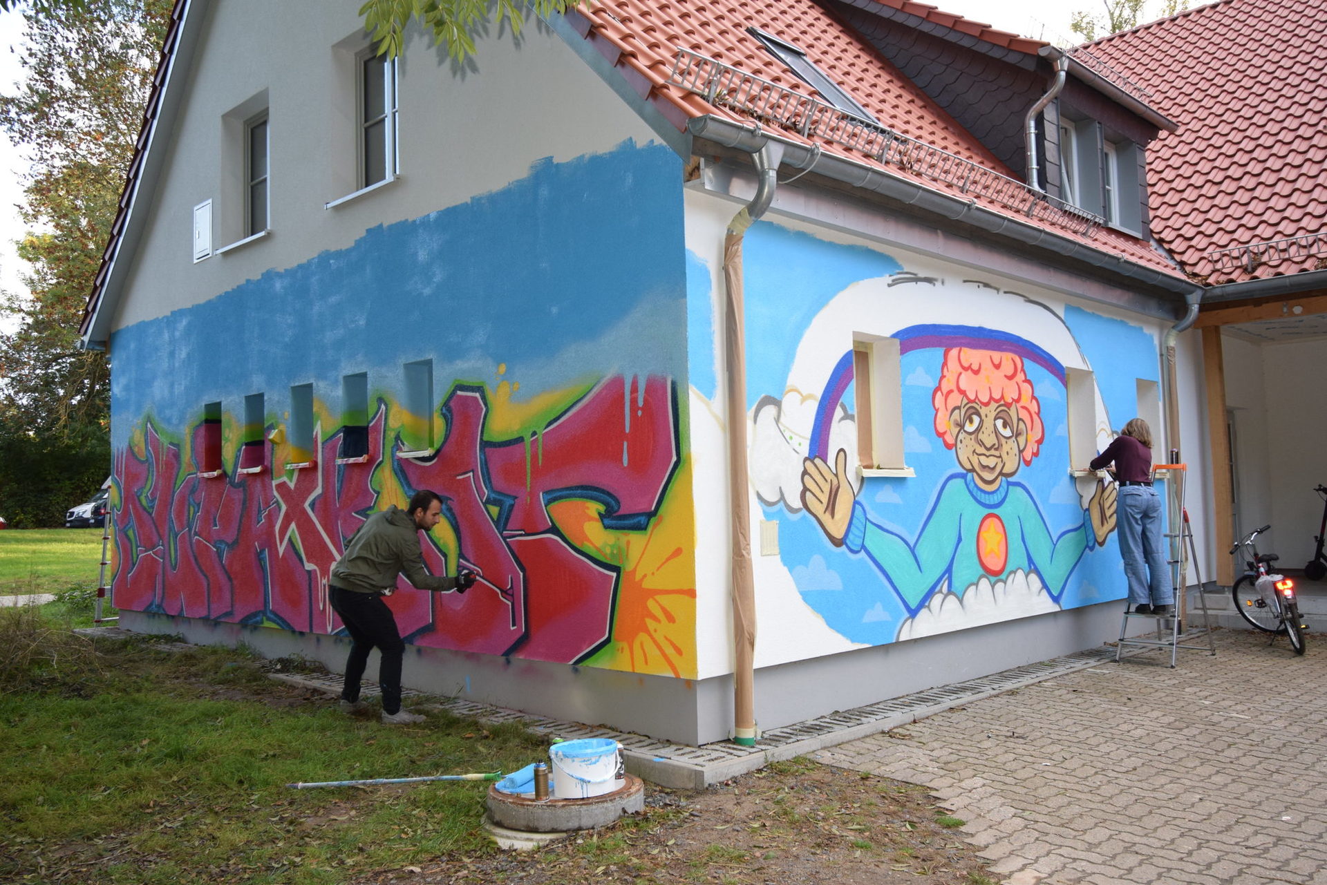 Alle Beteiligten freuen sich erst einmal über die malerische Umsetzung der Ideen und Vorschläge, die immer noch mal etwas angepasst werden müssen, und bedanken sich bei dem Sprayer-Team für dieses besondere Engagement.
