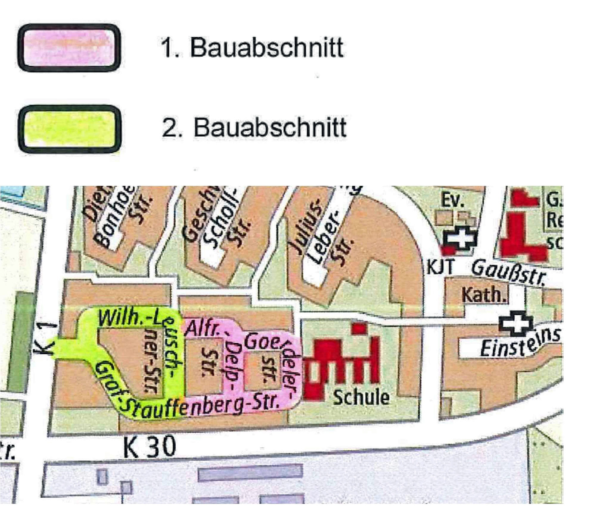 Der erste Bauabschnitt vom 29. März bis 1. April umfasst die Straßen: Goerdeler Straße, Alfred-Delp-Straße und der obere Teil der Graf-Stauffenberg-Str. bis Wilhelm-Leuschner-Straße.
