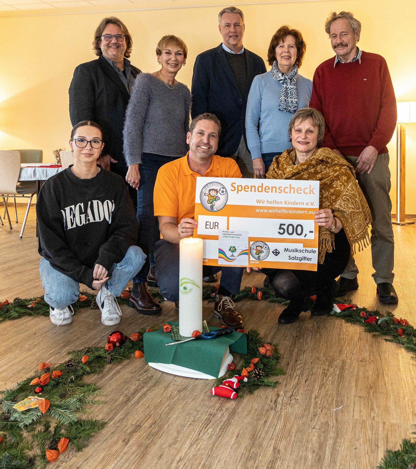 Spendenübergabe mit Praktikantin Jolie Janecek, Fachdienstleiter Hartmut Schölch, Christiane Voß und Thomas Wolf vom Verein „Wir helfen Kindern“, Kulturdezernent Jan Erik Bohling, Gabriele Grabenhorst (Schriftführerin Hospiz-Initiative), Musikschulleiterin Sabine Petter und Heribert Pietschmann (stellv. Vorsitzender Hospiz-Initiative).