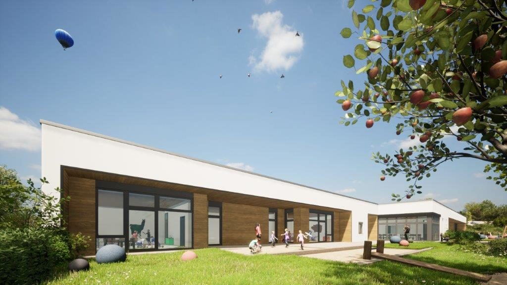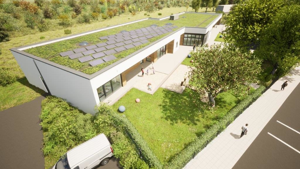 Das geplante Kita-Gebäude „Am Brotweg“ (etwa 40 Meter x 18 Meter) ist als eingeschossiges, kompaktes und barrierefreies Gebäude geplant und bietet Platz für 30 Krippenkinder und 50 Kindergartenkinder.