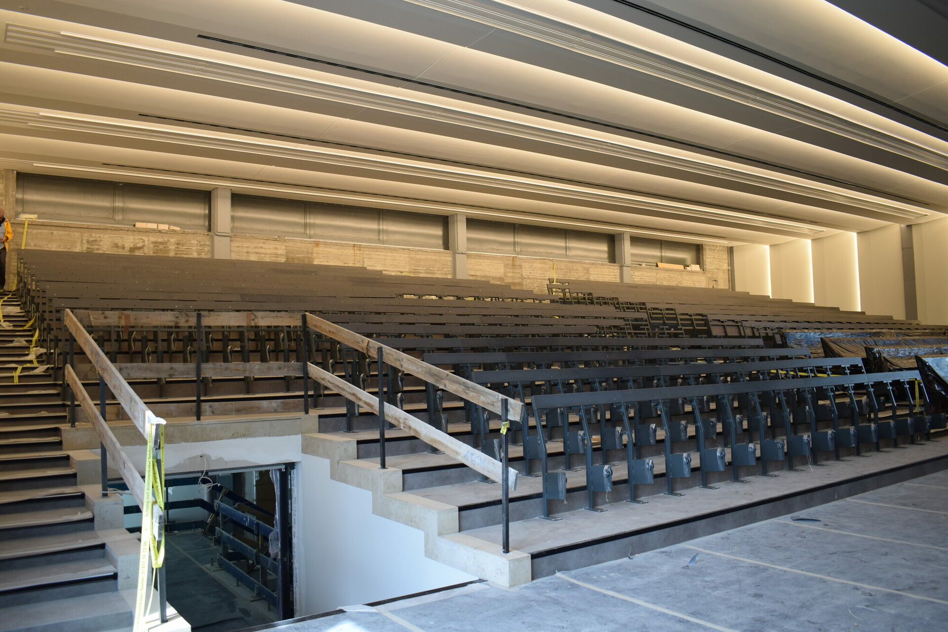 Die Hauptgewerke sind abgeschlossen. Derzeit finden die Ausbauarbeiten statt. Es wird Bodenbelag verlegt und es werden Malerarbeiten durchgeführt. Die Fertiginstallation für die Sanitär- und Elektroarbeiten sowie der Einbau der Saalbestuhlung ist für April/Mai 2025 vorgesehen.