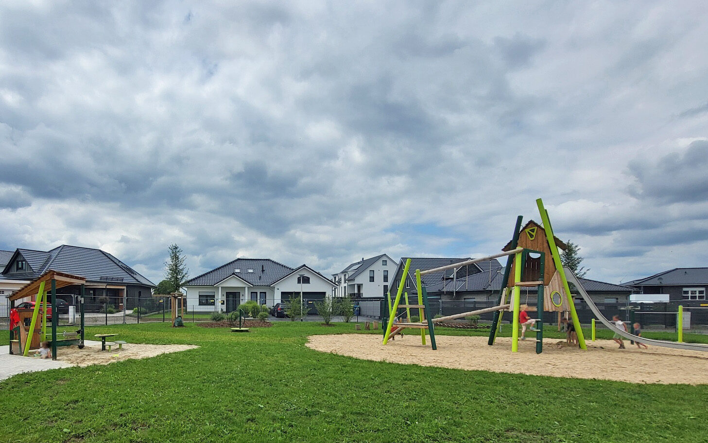 Der Spielplatz bietet vielfältige neue Spielmöglichkeiten wie ein Klettergerüst mit Rutsche, eine Doppelschaukel, ein Stehkarussell, eine Balancierstrecke, ein Doppelreck sowie ein Sandspielhaus und ein Wackeltier für jüngere Kinder. Eine neben dem Spielplatz hergestellte Grünfläche mit Rasen und Wildblumenwiese sowie zahlreichen Bäumen erweitert das Angebot an öffentlichem Grün im neuen Baugebiet.